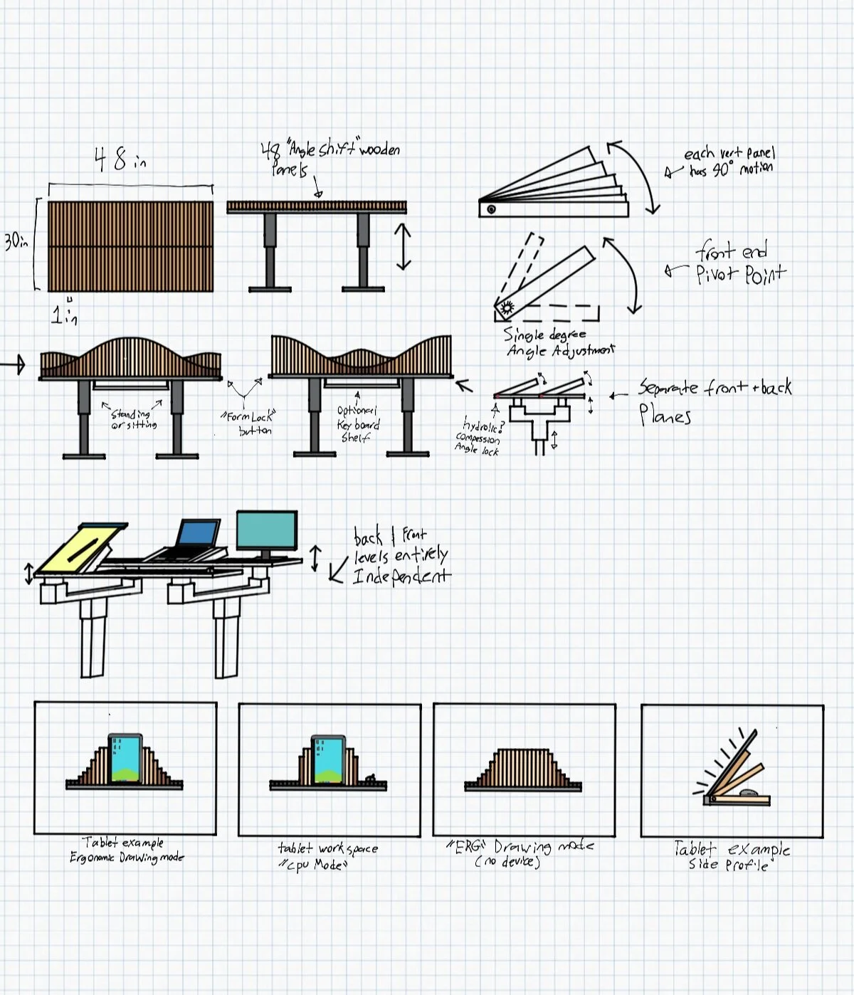 As a Designer I find myself constantly adjusting my body and desk throughout any given design experience. I like to sketch on a mildly angled surface, outline on a flat horizontal surface, and paint on a near ninety degree easel. all while using my laptop, and monitor on the same surface.