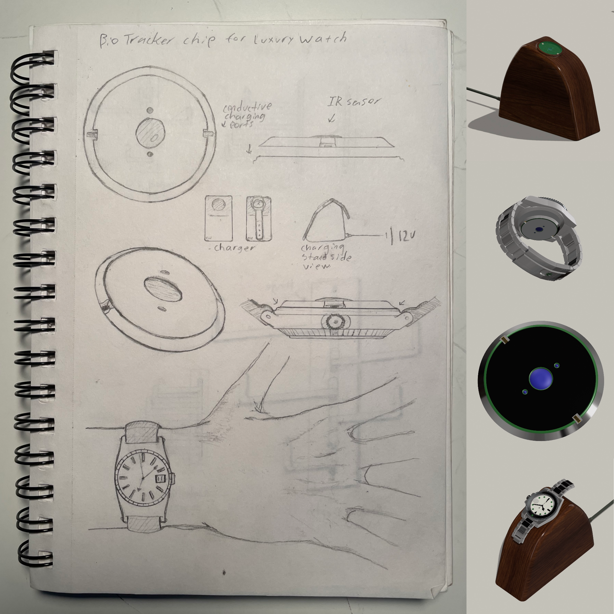 One the past five years I have developed an interest in horology and the art of watchmaking. As humanities oldest engineering feat, clocks and watches have held a special place in society, one that is slowly fading as the higher tech, smart alternatives change the way we view wearables. As I am also one of the many in my generation who is fixated on health, I love what these new products bring, but am unwilling to compromise my love of simple, automatic, handcrafted watches. This speculative project seeks to bridge these seemingly incompatible interests by adding a removable chip, capable of capturing the same high quality bio-signatures, to the back of existing luxury watches. Allowing for the benefits of tech, to merge with the craftsmanship of high watchmaking.