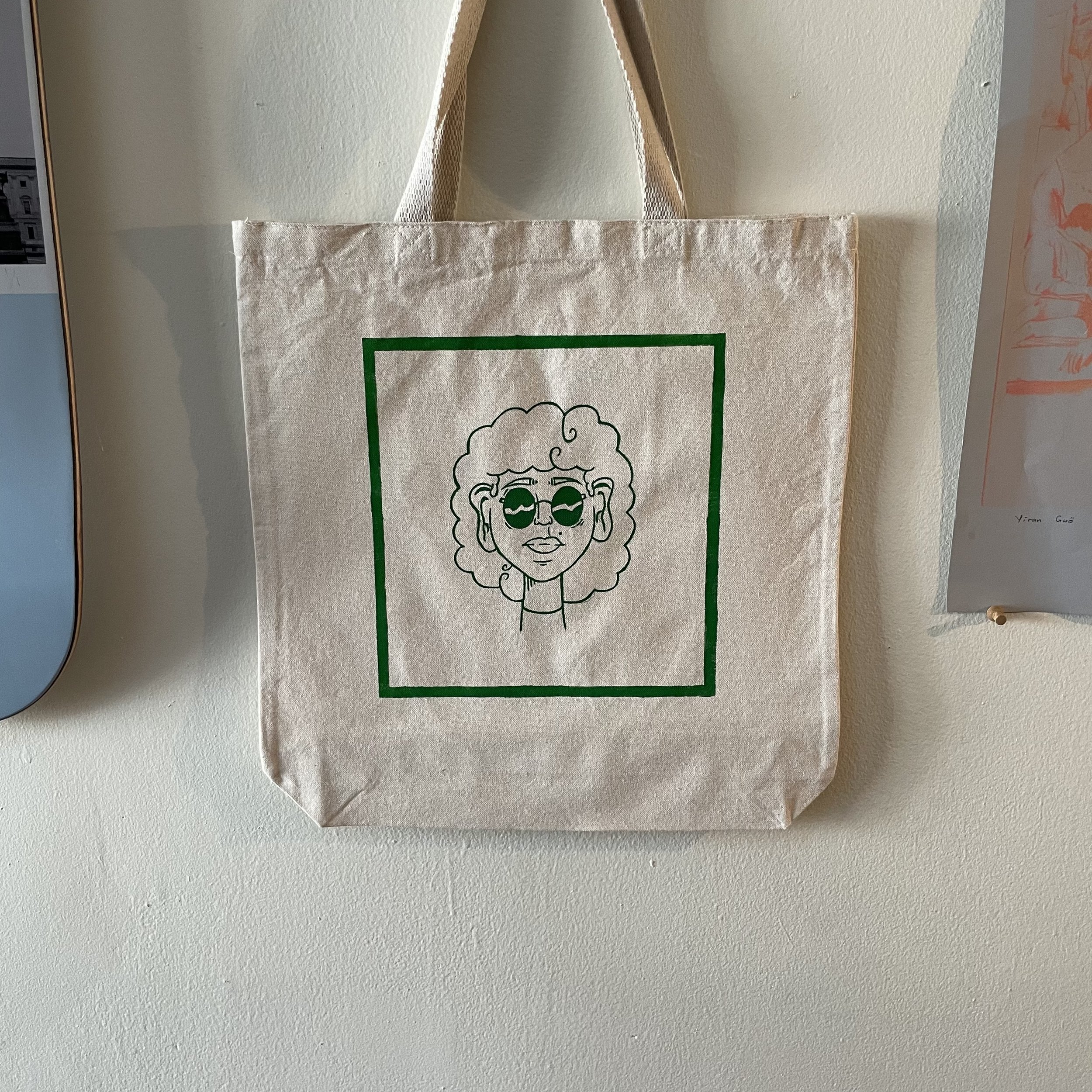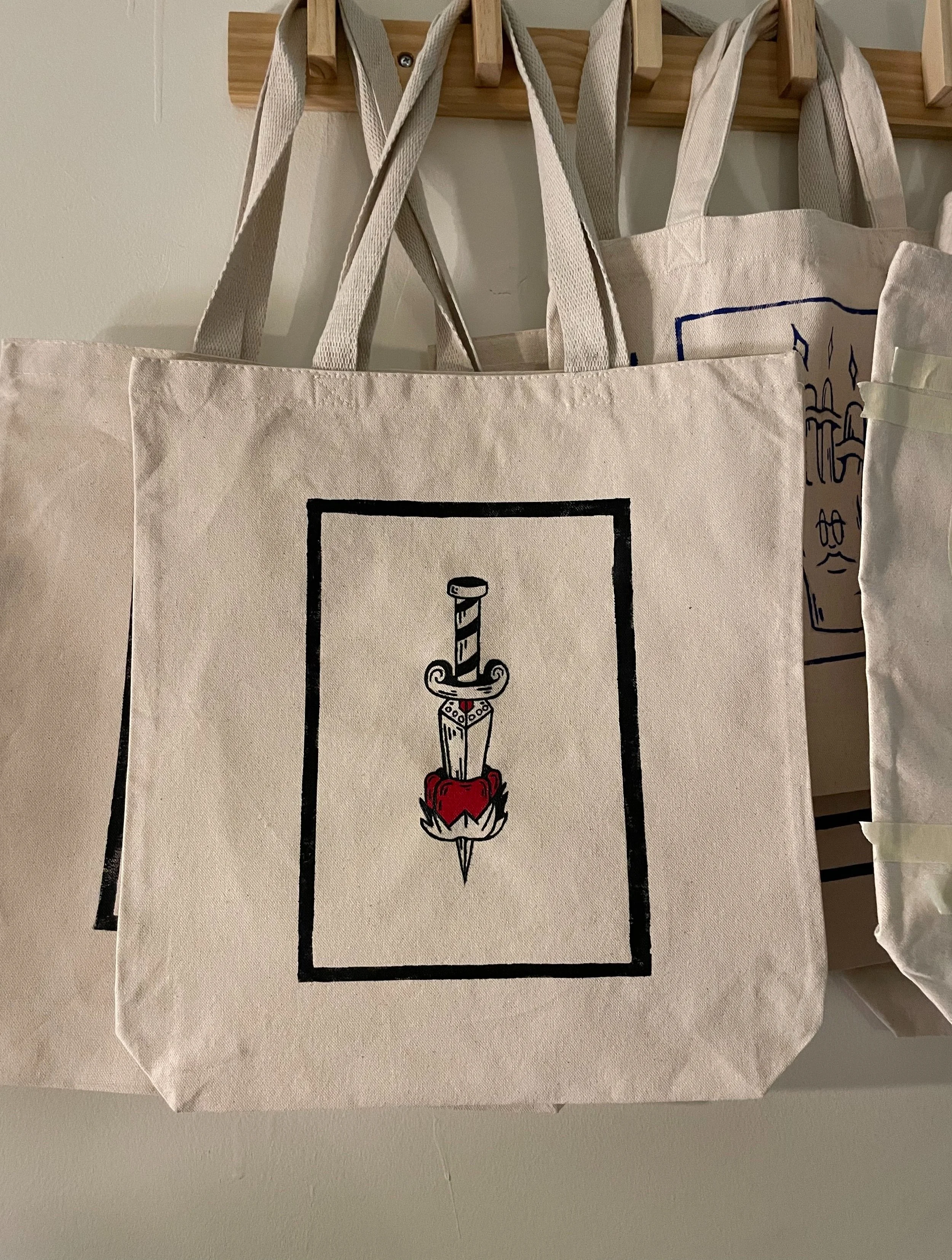 Hand-painted on to standard canvas tote bags. Graphics originally rendered and created in Illustrator and procreate, then painstakingly painted with flexible water based paint onto totes. 50/50 proportion of personal designs, and commissioned work.