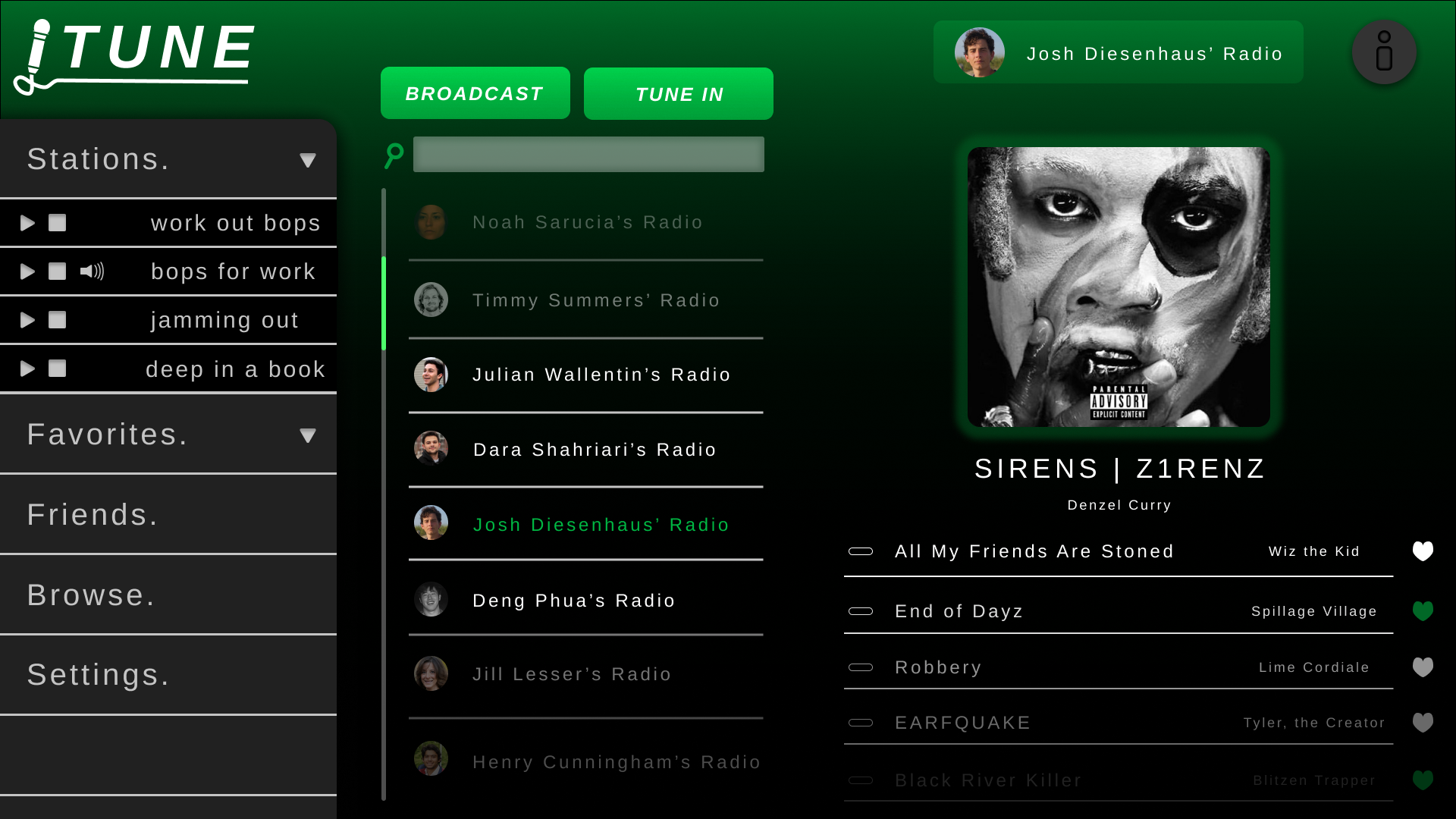 Tune is a hypothetical widget or add-on for music streaming services such as Apple Music, Spotify, or SoundCloud. It allows one create a live broadcast of whatever song or playlist they are currently listening to, empowering their friends and fans to tune in to a personally curated listening experience. It allows for saved, pre-made playlists, as well as real time music selection. Users can “like” and save tracks that they enjoy to their own music libraries. Write playlist descriptions to communicate mood and intensity of the prospective music selections. And save well received radio sessions as new “sets” or playlists that can then be referenced again. Tune, the one stop shop for music sharing and vibe curation.